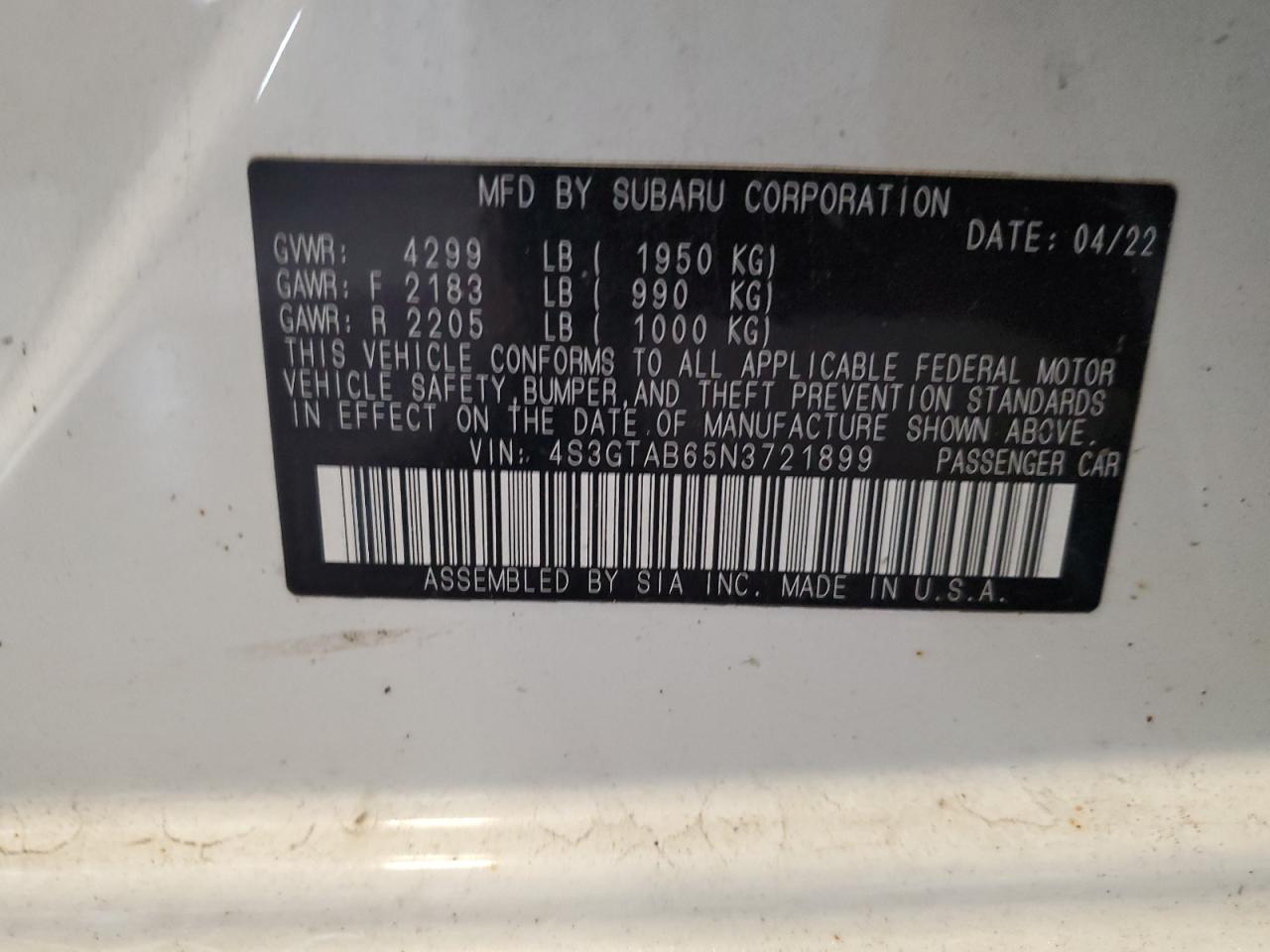 2022 SUBARU IMPREZA - 4S3GTAB65N3721899, колір - Білий, 2.0, Бензин, Повний привід із США