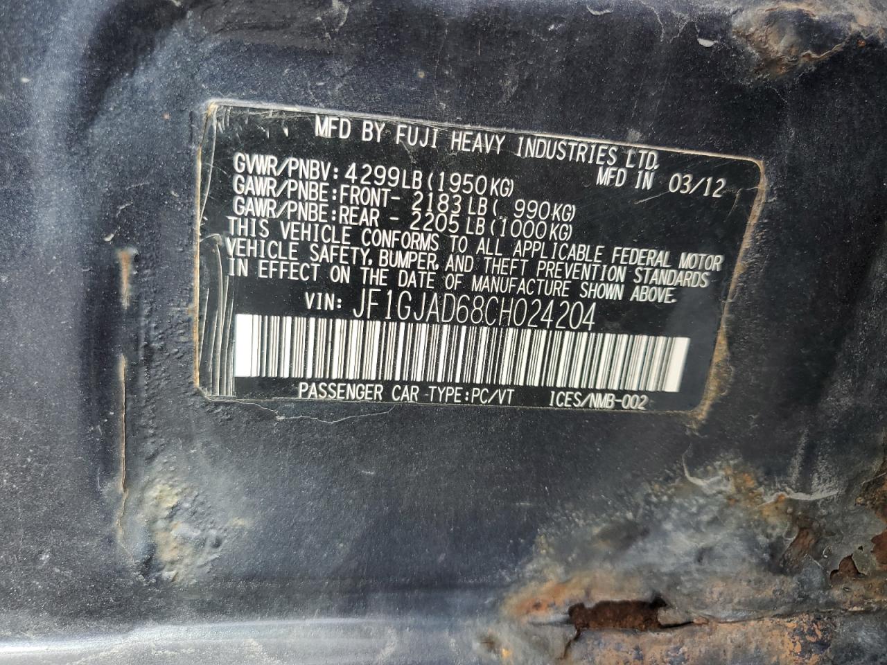 Колір Деревне вугілляЦиліндри 4Привід Повний привідVIN JF1GJAD68CH024204Стан Заводиться та їде (перевірено)Ушкодження НезначніДата аукціона 2025-10-08