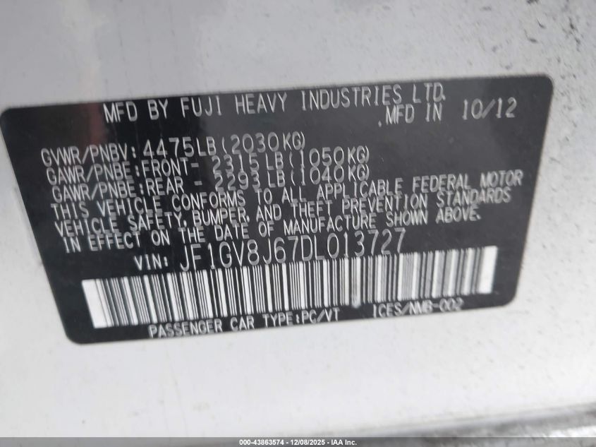 2013 SUBARU IMPREZA WRX - JF1GV8J67DL013727, колір - Білий, 2.5, Бензин, Повний привід із США