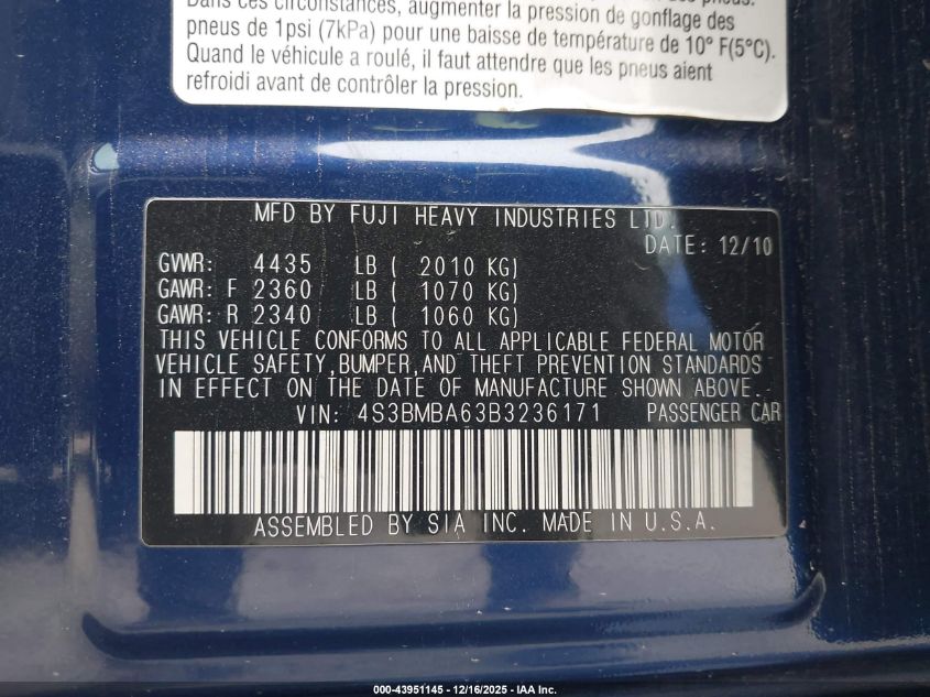 2011 SUBARU LEGACY - 4S3BMBA63B3236171, колір - , 2.5, Бензин, Повний привід із США
