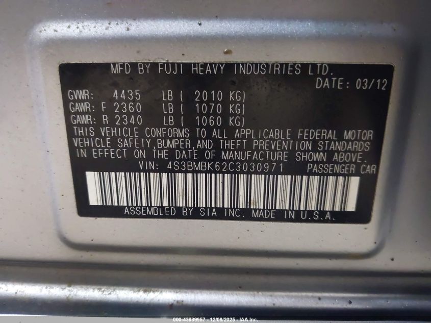 2012 SUBARU LEGACY - 4S3BMBK62C3030971, колір - Срібний, 2.5, Бензин, Повний привід із США