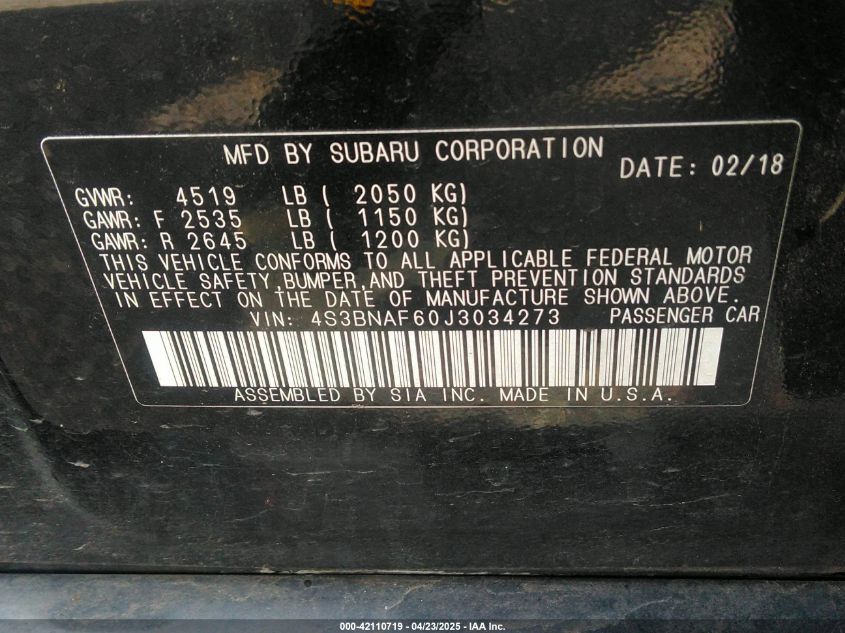2018 SUBARU LEGACY - 4S3BNAF60J3034273, колір - Чорний, 2.5, Бензин, Повний привід із США