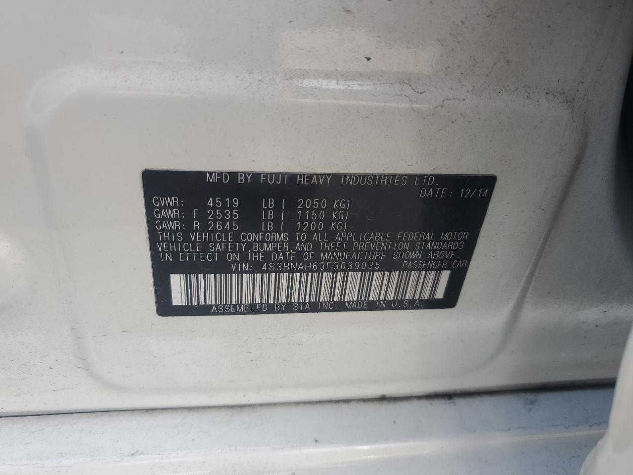 2015 SUBARU LEGACY - 4S3BNAH63F3039035, колір - Білий, 2.5, Бензин, Повний привід із США