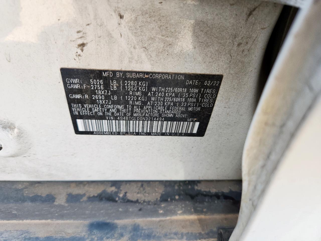 2022 SUBARU LEGACY - 4S4BTGLD0N3214494, колір - Білий, 2.4, Бензин, Повний привід із США
