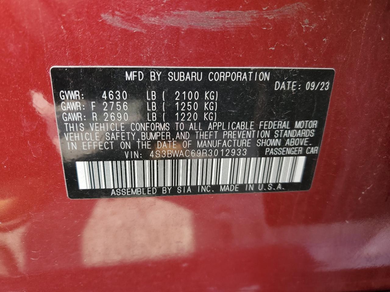 2024 SUBARU LEGACY - 4S3BWAC69R3012933, колір - Бургундія, 2.5, Бензин, Повний привід із США