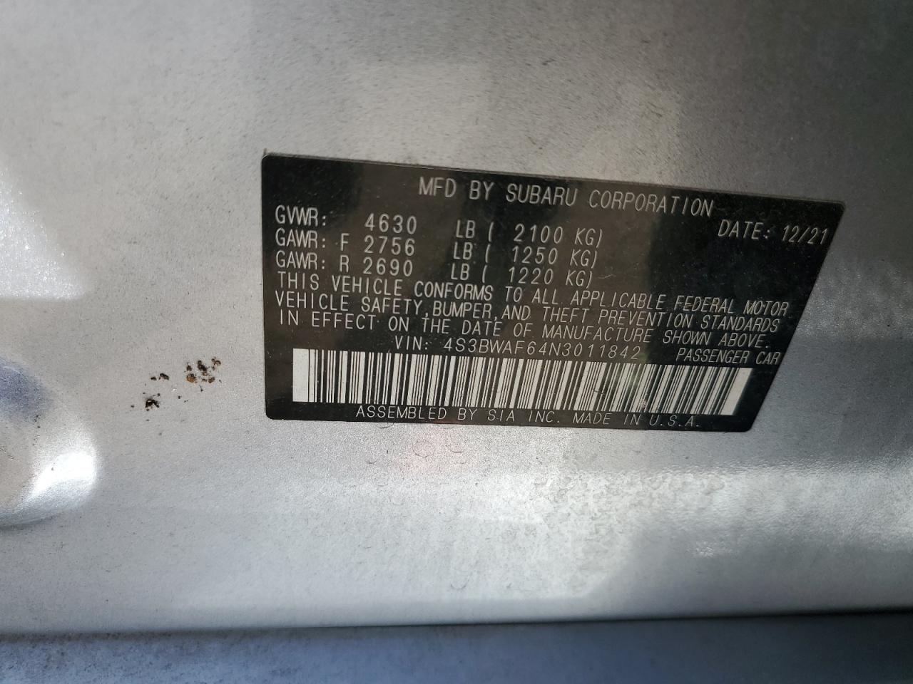 2022 SUBARU LEGACY - 4S3BWAF64N3011842, колір - Срібний, 2.5, Бензин, Повний привід із США