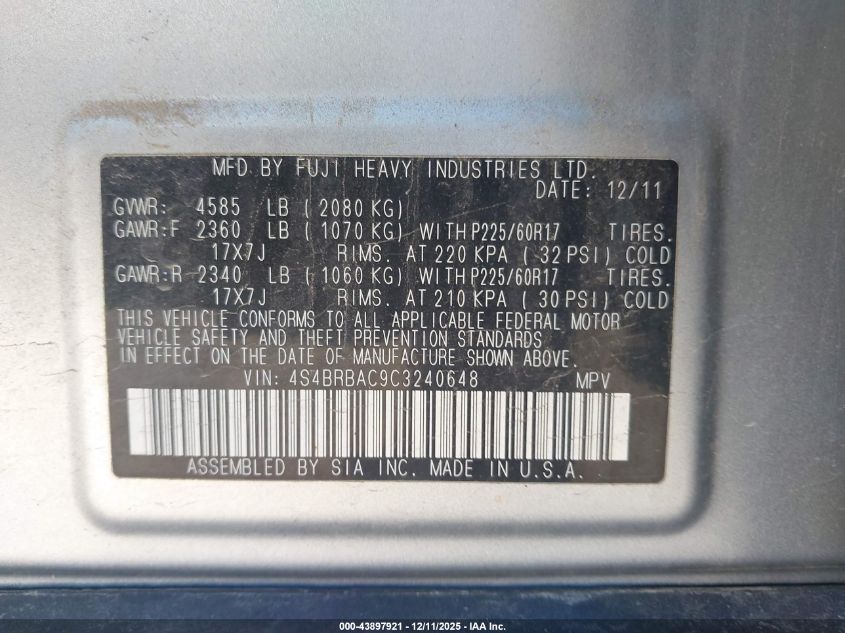 2012 SUBARU OUTBACK 2.5I PREMIUM