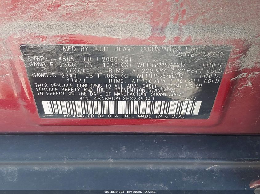 Колір Циліндри 4Привід Повний привідVIN 4S4BRCACXE3239341Стан НевідомоУшкодження Звичайний знос