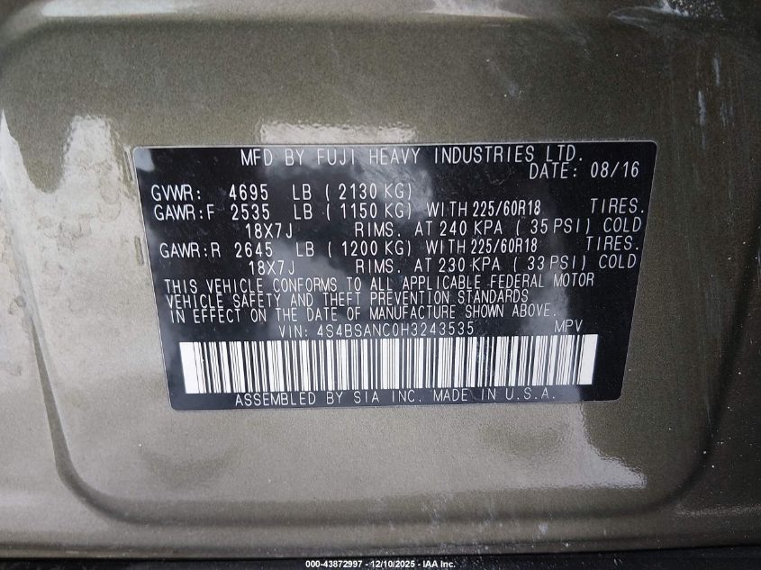2017 SUBARU OUTBACK - 4S4BSANC0H3243535, колір - Зелений, 2.5, Бензин, Повний привід із США