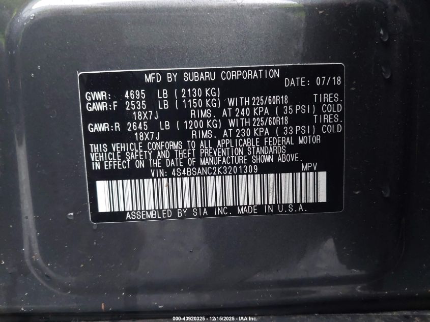 2019 SUBARU OUTBACK 2.5I PREMIUM