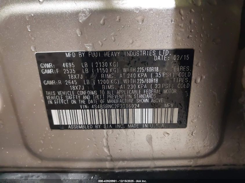 2015 SUBARU OUTBACK 2.5I LIMITED