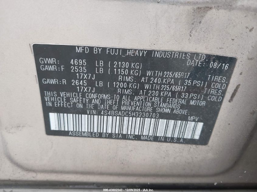 2017 SUBARU OUTBACK - 4S4BSADC5H3230703, колір - Срібний, 2.5, Бензин, Повний привід із США