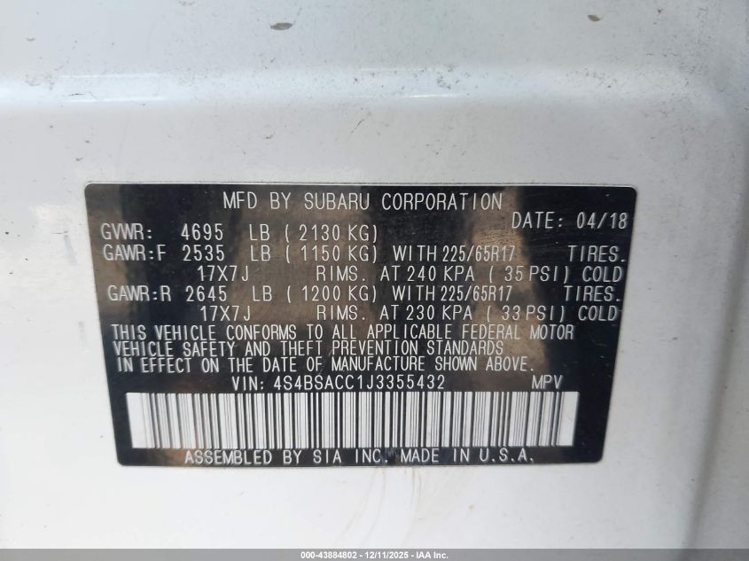 2018 SUBARU OUTBACK - 4S4BSACC1J3355432, колір - Білий, 2.5, Бензин, Повний привід із США
