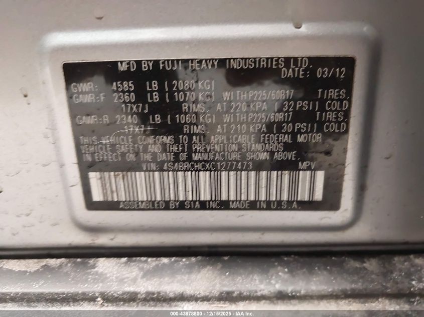 Колір СрібнийЦиліндри 4Привід Повний привідVIN 4S4BRCHCXC1277473Стан Заводиться та їде (перевірено)Ушкодження Передня права