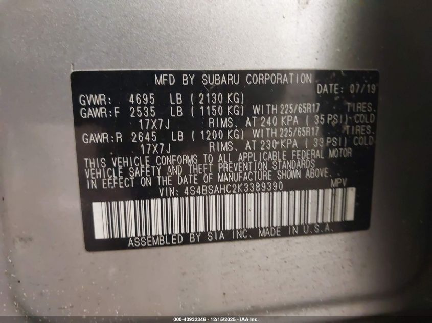 2019 SUBARU OUTBACK - 4S4BSAHC2K3389390, колір - Срібний, 2.5, Бензин, Повний привід із США
