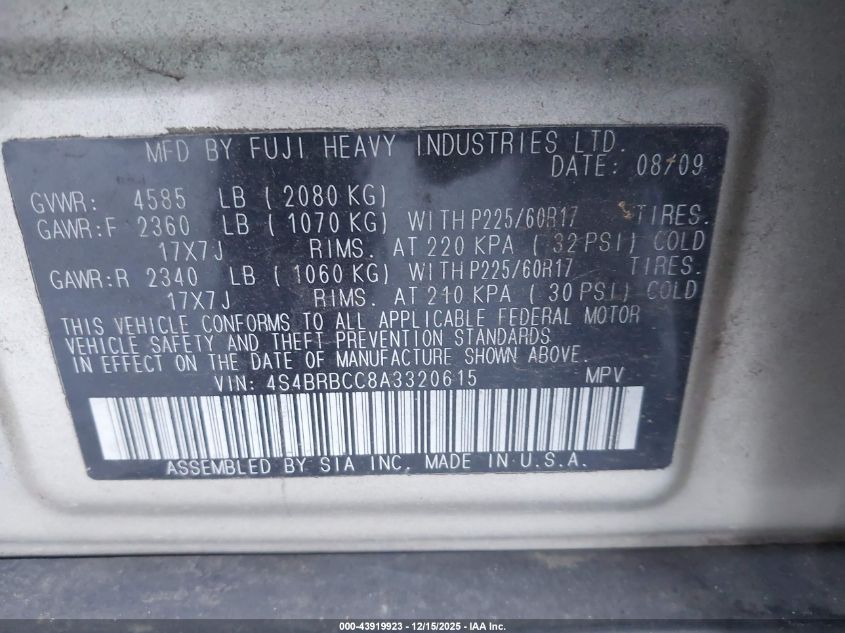 Колір БежевийЦиліндри 4Привід Повний привідVIN 4S4BRBCC8A3320615Стан СтаціонарноУшкодження Передня або задня