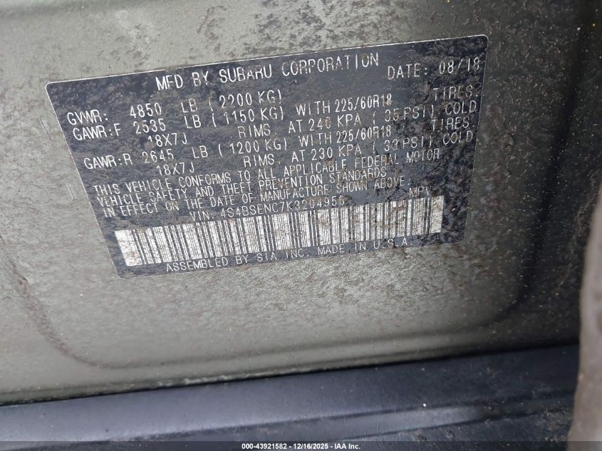 2019 SUBARU OUTBACK - 4S4BSENC7K3204956, колір - , 3.6, Бензин, Повний привід із США