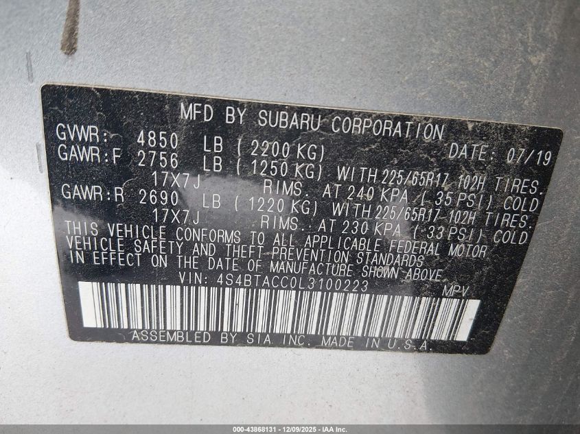 2020 SUBARU OUTBACK - 4S4BTACC0L3100223, колір - Срібний, 2.5, Бензин, Повний привід із США