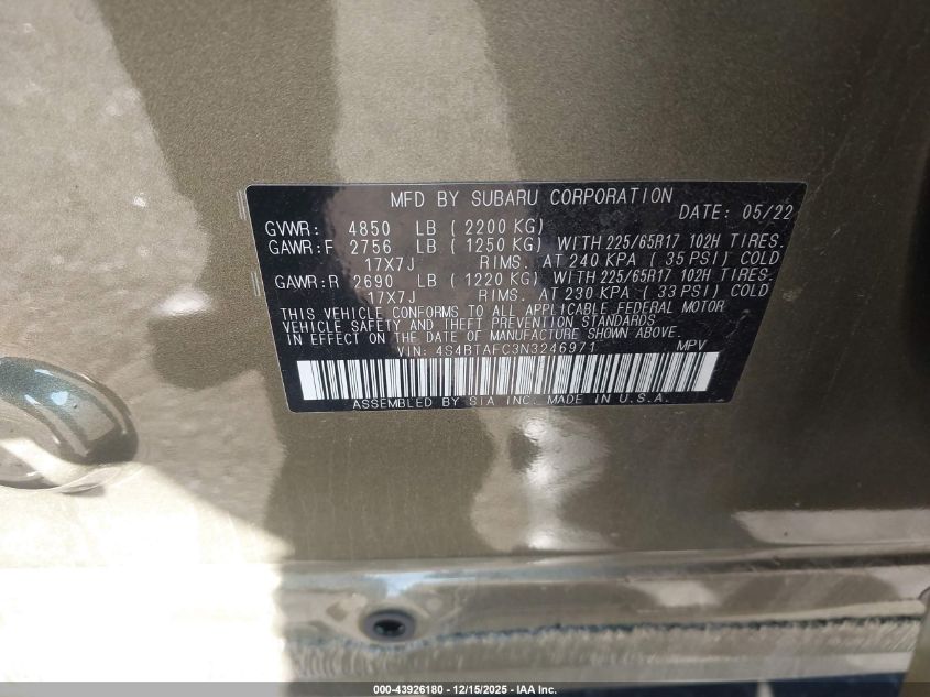 2022 SUBARU OUTBACK - 4S4BTAFC3N3246971, колір - Зелений, 2.5, Бензин, Повний привід із США