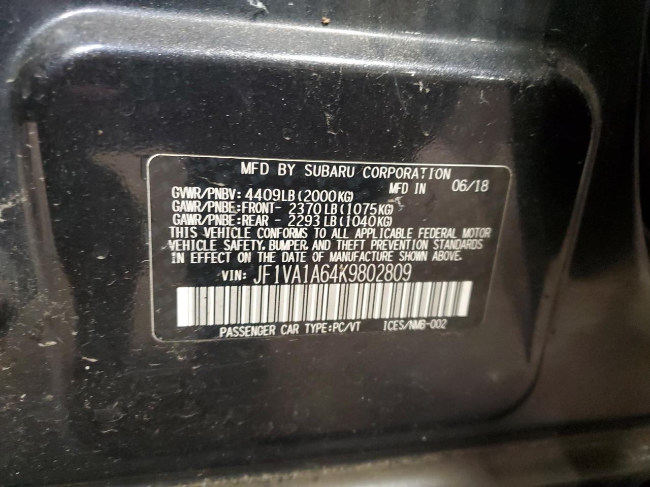 2019 SUBARU WRX - JF1VA1A64K9802809, колір - Деревне вугілля, 2.0, Бензин, Повний привід із США