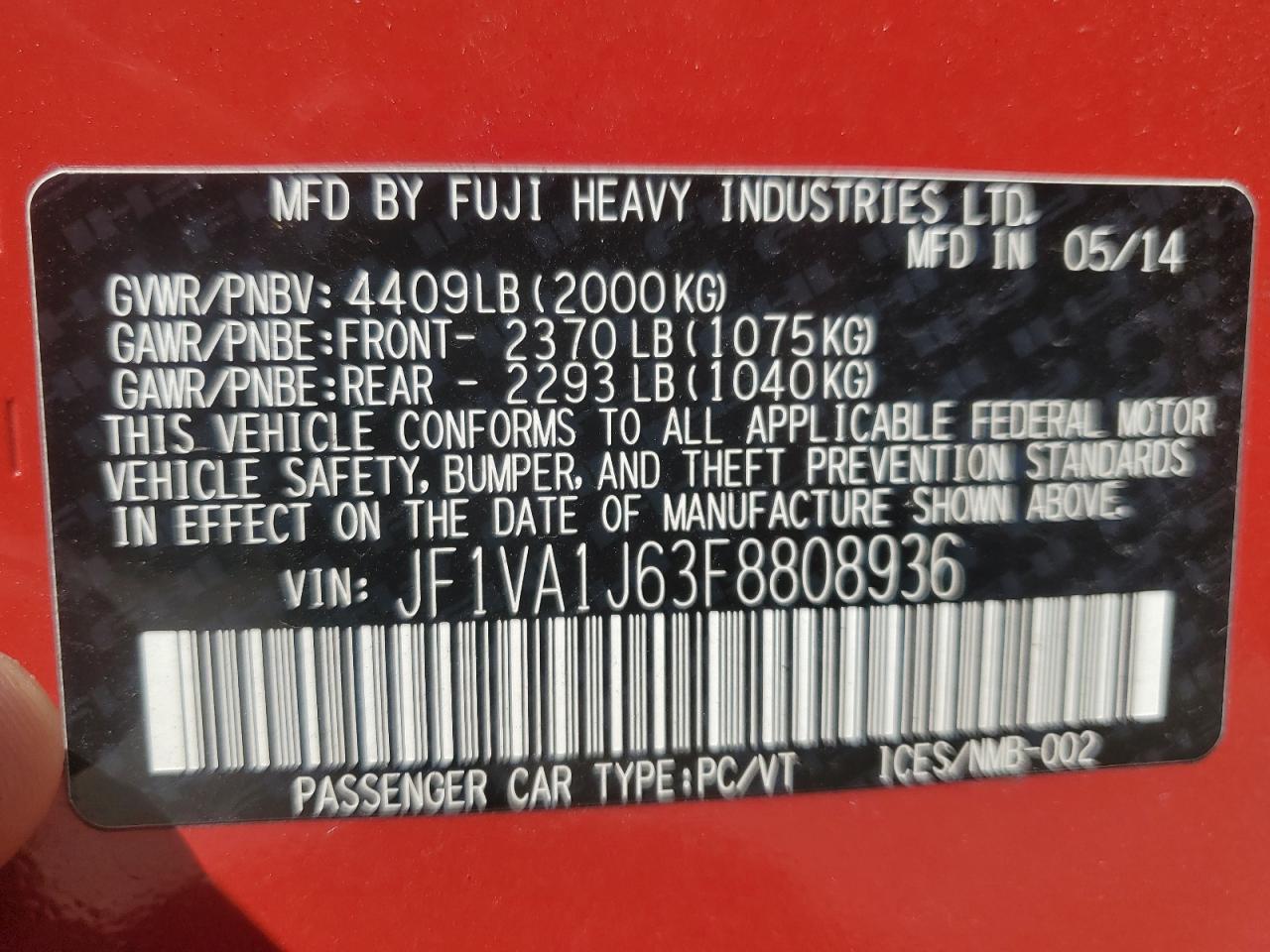 2015 SUBARU WRX - JF1VA1J63F8808936, колір - Червоний, 2.0, Бензин, Повний привід із США