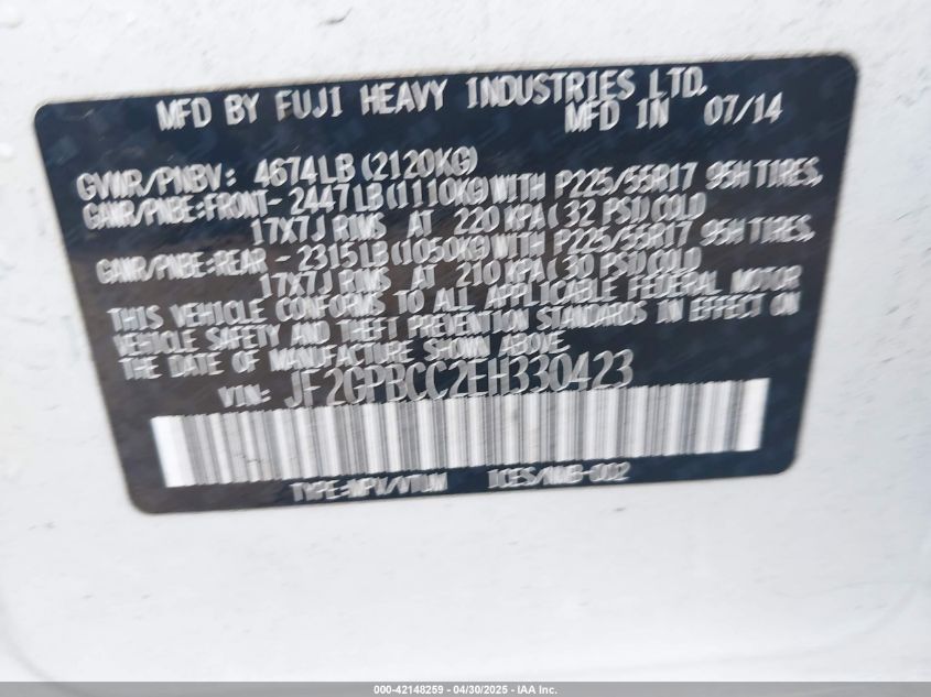 Колір БілийЦиліндри 4Привід Повний привідVIN JF2GPBCC2EH330423Стан СтаціонарноУшкодження Передня або задня