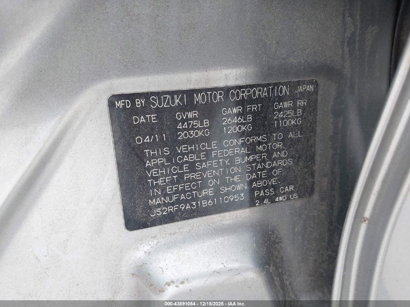 2011 SUZUKI KIZASHI - JS2RF9A31B6110953, колір - , 2.4, Бензин, Повний привід із США