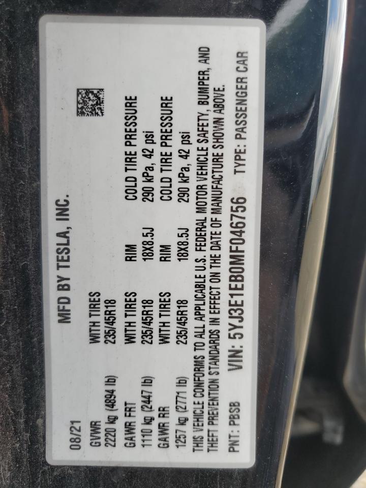 2021 TESLA MODEL 3 - 5YJ3E1EB0MF046756, колір - Чорний, , Електричний, Повний привід із США