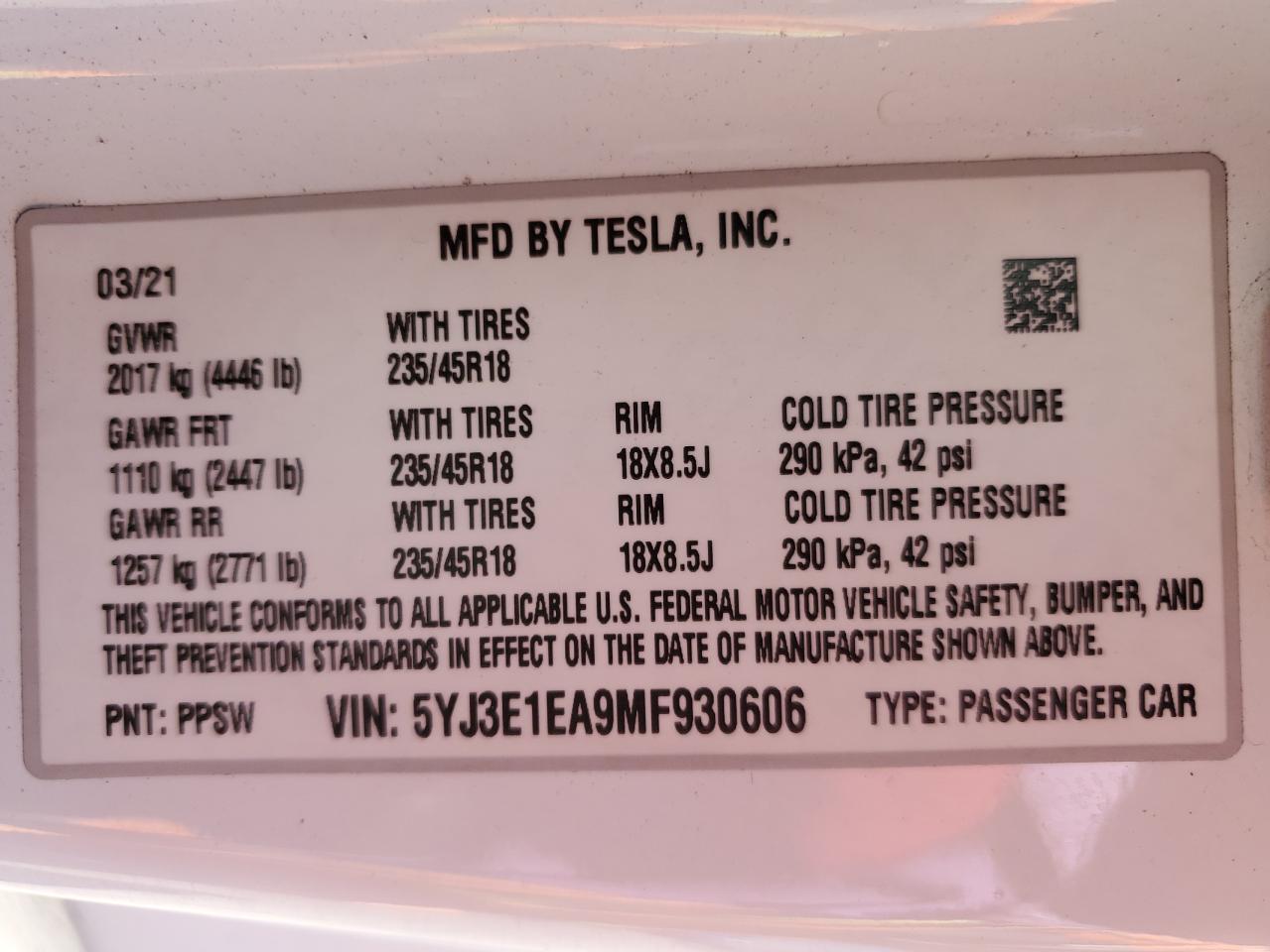 2021 TESLA MODEL 3 - 5YJ3E1EA9MF930606, колір - Білий, , Електричний, Задній привід із США