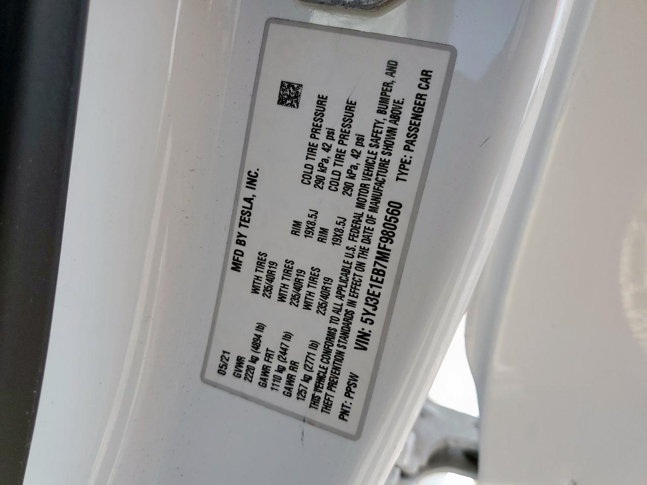 2021 TESLA MODEL 3 - 5YJ3E1EB7MF980560, колір - Білий, , Електричний, Повний привід із США
