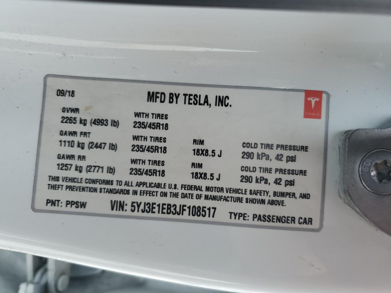 2018 TESLA MODEL 3 - 5YJ3E1EB3JF108517, колір - Білий, , Електричний, Повний привід із США