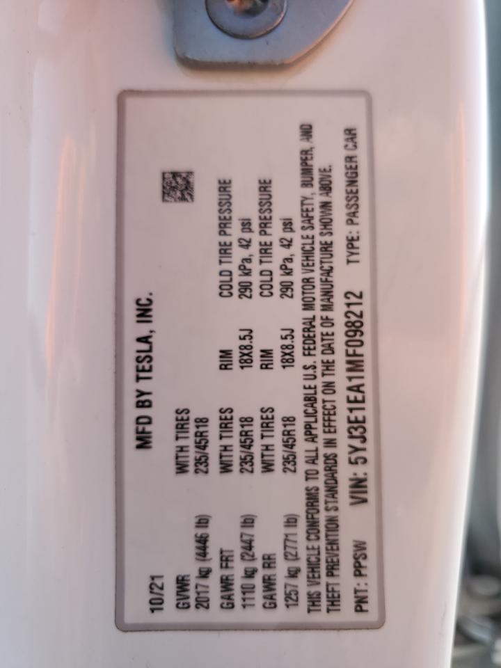 2021 TESLA MODEL 3 - 5YJ3E1EA1MF098212, колір - Білий, , Електричний, Задній привід із США