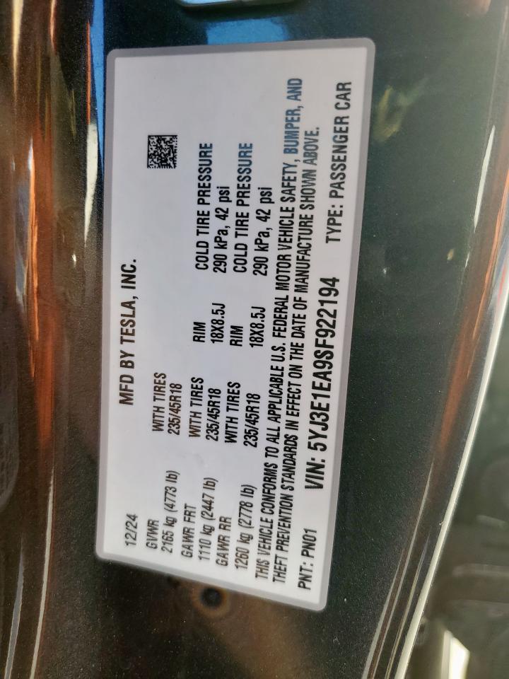 2025 TESLA MODEL 3 - 5YJ3E1EA9SF922194, колір - Сірий, , Електричний, Задній привід із США