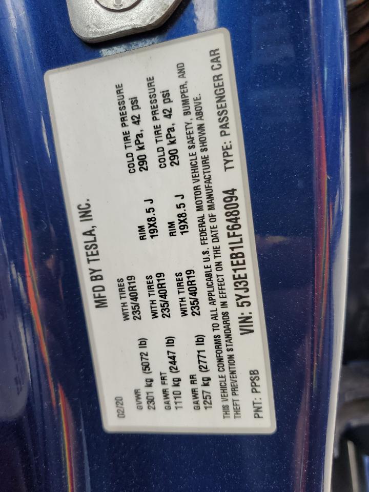 2020 TESLA MODEL 3 - 5YJ3E1EB1LF648094, колір - Синій, , Електричний, Повний привід із США