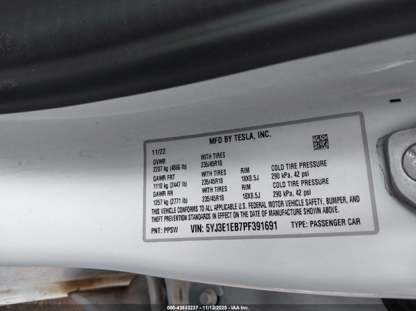 2023 TESLA MODEL 3 - 5YJ3E1EB7PF391691, колір - Білий, U, Електричний, Повний привід із США