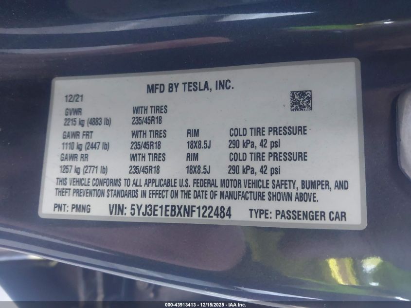 2022 TESLA MODEL 3 - 5YJ3E1EBXNF122484, колір - , U, Електричний, Повний привід із США