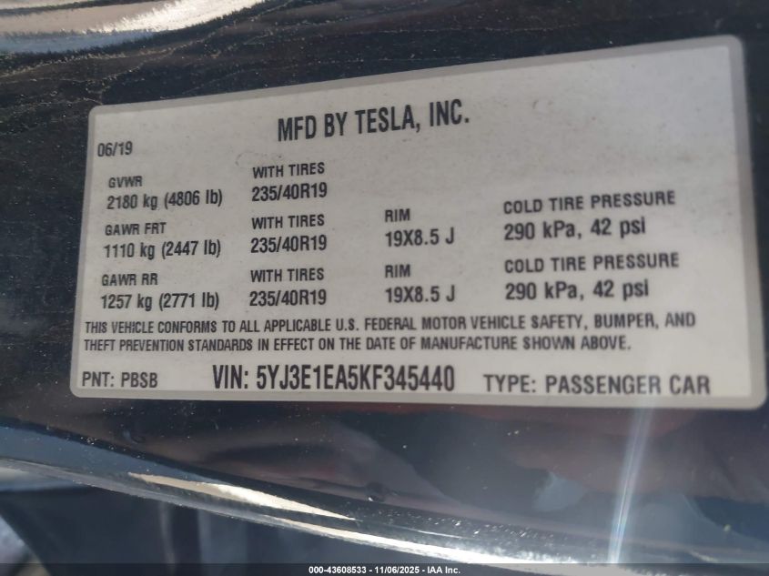 2019 TESLA MODEL 3 - 5YJ3E1EA5KF345440, колір - Чорний, U, Електричний, Задній привід із США
