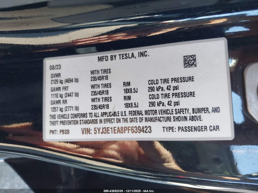 2023 TESLA MODEL 3 - 5YJ3E1EA8PF639423, колір - Синій, U, Електричний, Задній привід із США