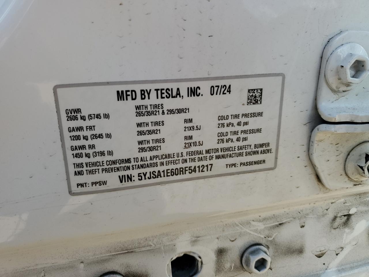 2024 TESLA MODEL S - 5YJSA1E60RF541217, колір - Білий, , Електричний, Повний привід із США