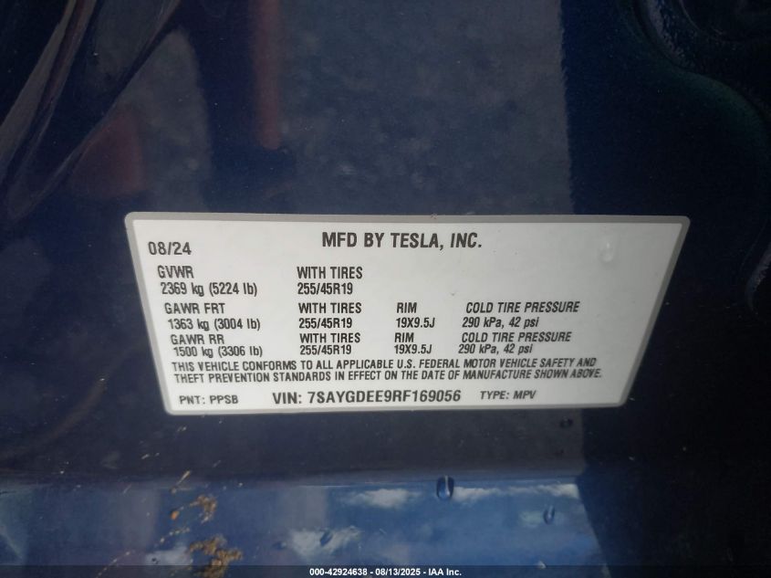 2024 TESLA MODEL Y - 7SAYGDEE9RF169056, колір - Синій, U, Електричний, Повний привід із США
