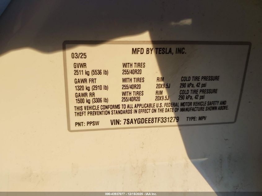 2026 TESLA MODEL Y - 7SAYGDEE8TF331279, колір - Білий, 0.0, Електричний, Повний привід із США