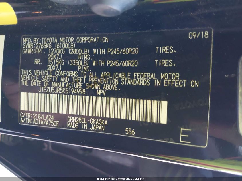2019 TOYOTA 4RUNNER - JTEZU5JR5K5194998, колір - Чорний, 4.0, Бензин, із США