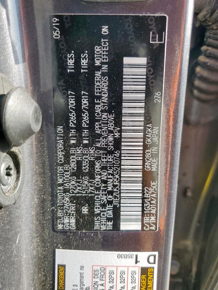 2019 TOYOTA 4RUNNER - JTEZU5JR5K5210746, колір - Деревне вугілля, 4.0, Бензин, Задній привід із США
