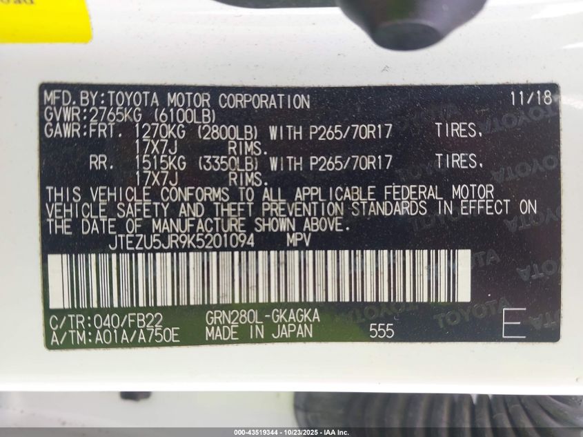 2019 TOYOTA 4RUNNER - JTEZU5JR9K5201094, колір - Білий, 4.0, Бензин, із США