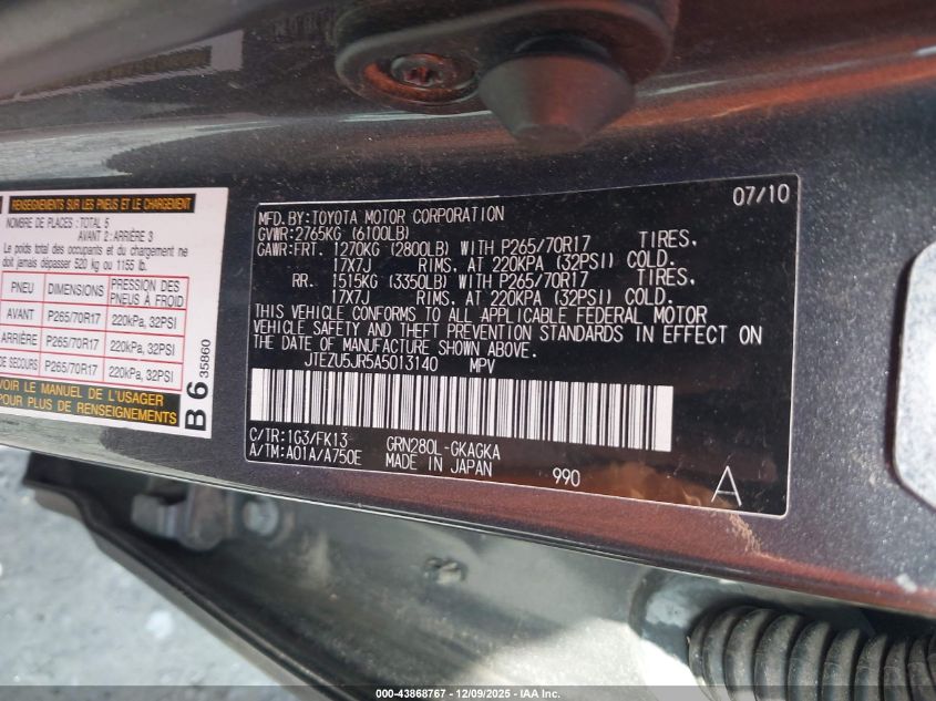 Колір СірийЦиліндри 6VIN JTEZU5JR5A5013140Стан СтаціонарноУшкодження Перекидання