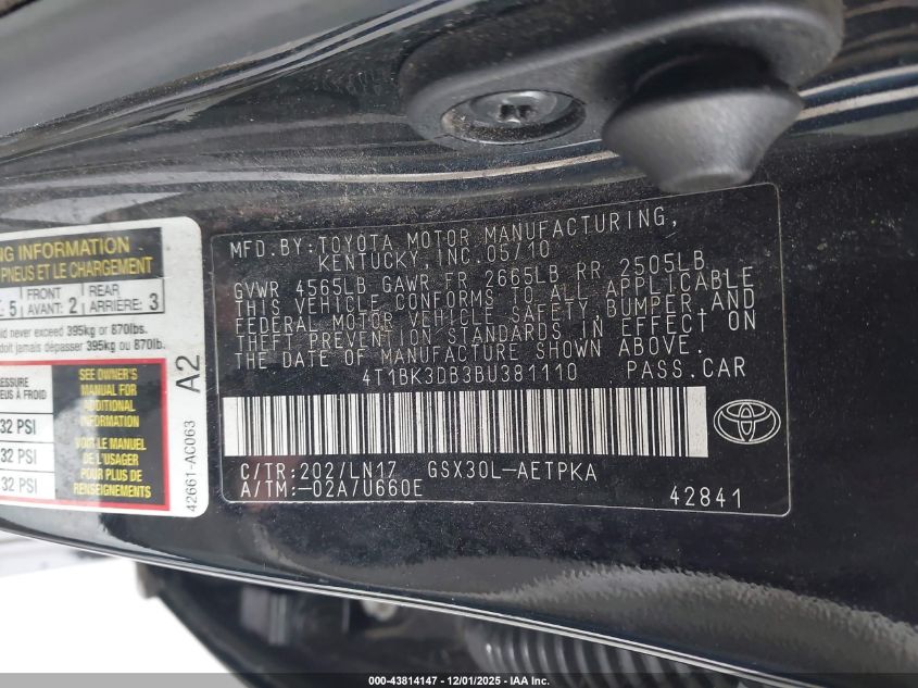 2011 TOYOTA AVALON - 4T1BK3DB3BU381110, колір - Чорний, 3.5, Бензин, Передній привід із США