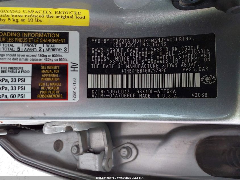 Колір СрібнийЦиліндри 6Привід Передній привідVIN 4T1BK1EB4GU227936Стан Заводиться та їде (перевірено)Ушкодження Передня ліва