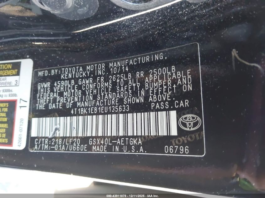 2014 TOYOTA AVALON - 4T1BK1EB1EU135633, колір - Чорний, 3.5, Бензин, Передній привід із США