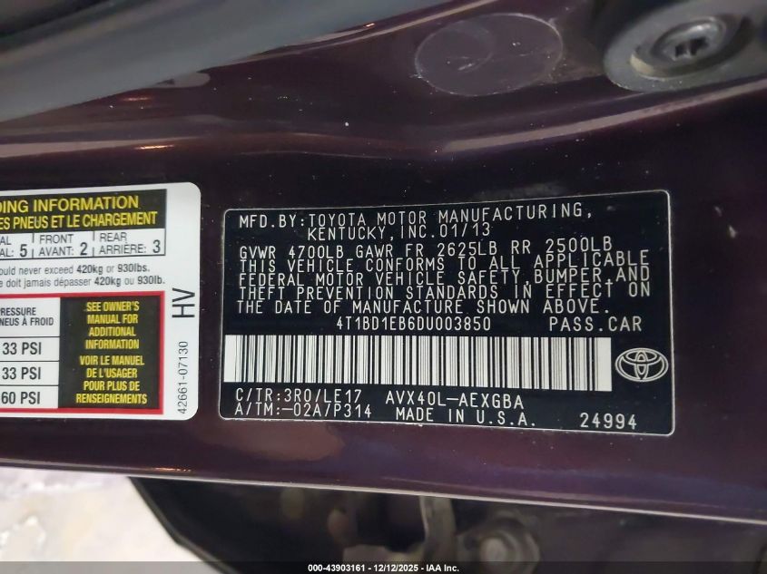 Колір БургундіяЦиліндри 4Привід Передній привідVIN 4T1BD1EB6DU003850Стан Заводиться та їде (перевірено)Ушкодження Звичайний зносДата аукціона 2025-12-23