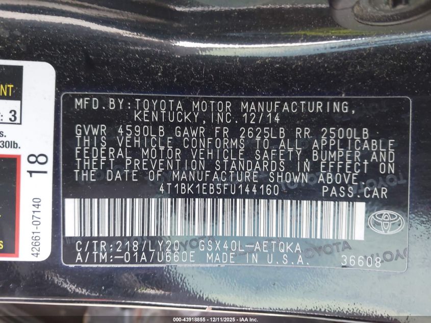 2015 TOYOTA AVALON - 4T1BK1EB5FU144160, колір - Чорний, 3.5, Бензин, Передній привід із США